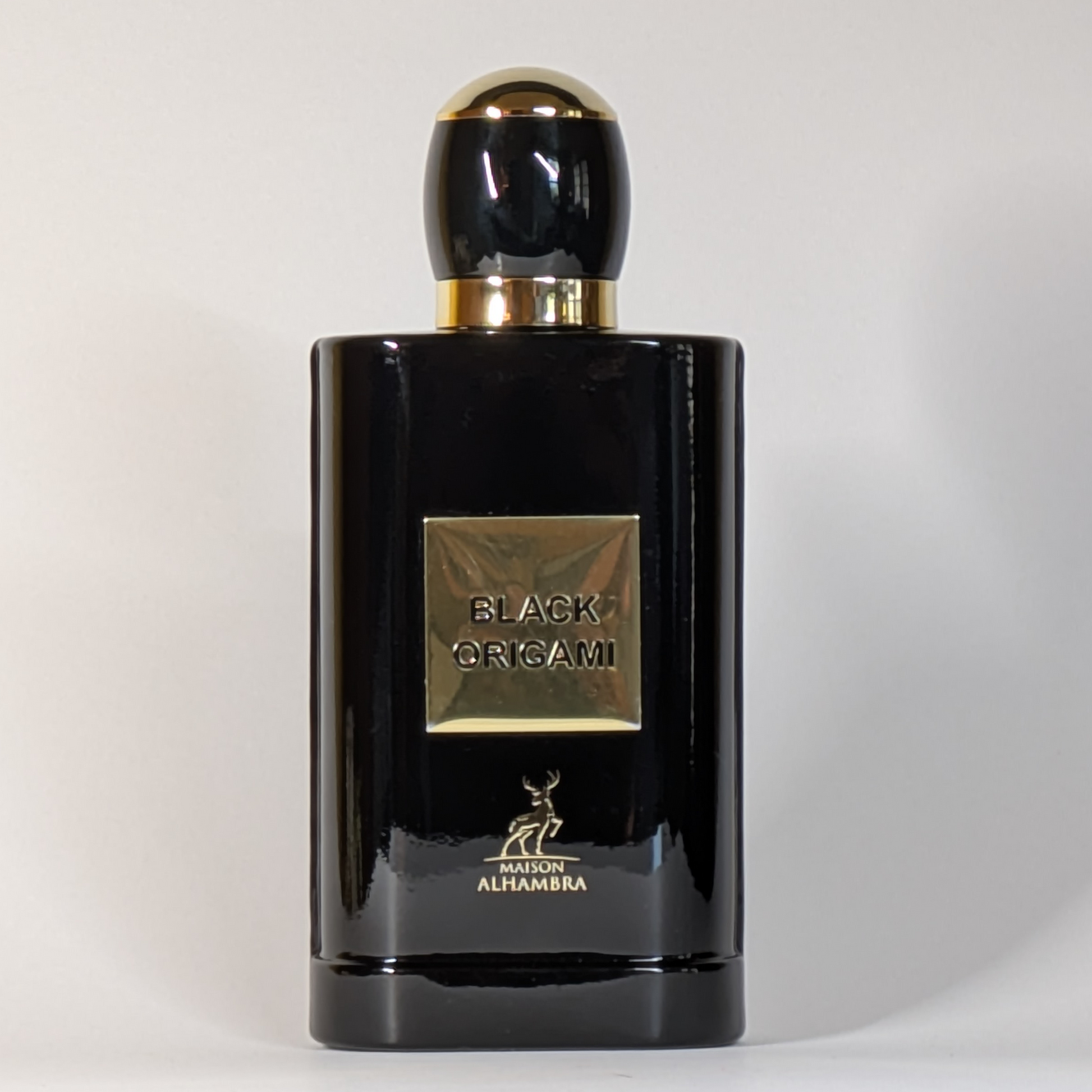 Black Origami was inspired by Tom Ford's Black Orchid. The top notes are truffle, gardenia, cassis, jasmine, ylang ylang, Italian lemon, tangerine, and bergamot, the middle notes are orchid, gardenia, jasmine, ylang ylang, and lotus, the base notes are chocolate, patchouli, vanilla, incense, amber, sandalwood, vetiver, and white musk.